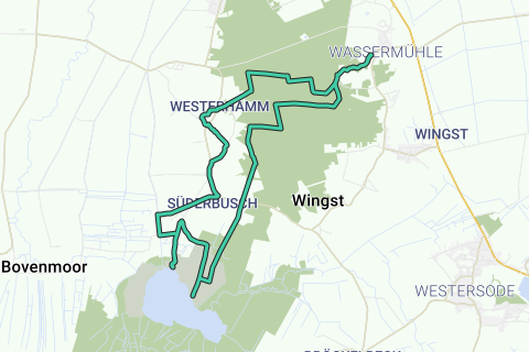 På startpunktet ved den gratis parkeringsplads ved zoologisk have i Wingst fører vejen dig forbi det tyske olympiade med det navngivne udsigtstårn. Det går fra øst til vest gennem Wingster Skov over Heidkamp- og Schwedenfeldbanen til Westerhamm. Derfra fører vandrestien over åbent mark og langs skovbrynet først til Süderbusch og derefter ind i naturreservatet Balksee og Randmoore. Her kan du også opdage en del af det tætte væghegnsnetværk i den vestlige del af Wingst. Efterfølgende går det tilbage over Silberberg og forbi Stenhøj til startpunktet.