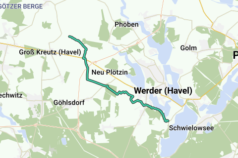 Område til frugtproduktion sydvest for Potsdam har ikke kun i over 100 år forsynet hovedstaden Berlin med friske frugter, men har også siden da været et af de mest populære udflugtsmål for berlinererne. Det bølgede landskab med sine indkapslede søer, de talrige slotanlæg, frugtplantagerne og ikke mindst Tysklands nordligste vinproduktionsområde er lige præcis perfekt til en landtur. Den for kun få år siden etablerede vandresti forbinder disse attraktioner som en perlekæde. Længde: 16 km (4-5 t) Start: Petzow Mål: Krielow Logo / vejmarkering: grønne informationsskilte med æble Ankomst: Fra Berlin Hauptbahnhof med RE1 (Magdeburg til Werder / Havel). Herfra videre med bus 631 til stoppestedet Werder / Havel, Post, hvor bus 636 til slotparken Petzow kan tages (ca. 1 time). Afgang: Fra Krielow med bus 637 til Groß Kreutz. Herfra videre med R1 (Frankfurt / Oder) til Hauptbahnhof Berlin (ca. 1 time). Forløb: Petzow, Glindow, Derwitz, Krielow Vejbeskrivelse: Stien starter i sin østlige ende i den lille landsby Petzow. Mod nord går man forbi naturreservatet "Glindower Alpen" (det bjergrige område, der er opstået ved udvinding af ler, er også en vandretur værd) mod Glindow. Stien drejer mod vest i retning af Elisabethhöhe og når der Obstanbaugebiet Werder (Havel). Flere gårde inviterer til at holde pause eller plukke frugt. Flere slutmorænebakker tilbyder vidt udsyn over landskabet, der især under blomstringen har en uforlignelig charme. Man vandrer både gennem gamle kirsebærplantager og nyplantede æbleplantager for til sidst at nå Derwitz. Et par hundrede meter videre ligger der ved Krielow et busstoppested, hvor hjemturen kan påbegyndes. Seværdigheder: Petzow: Slotpark, Schinkelkirche Glindow: Teglværksmuseum, Frilandsbade, "Glindower Alpen" Derwitz: Landsbykirke, Lilienthal-mindesmærke Kombinationsmuligheder: Runde om Potsdamer Havelseer Veje / Stiens tilstand: ingen oplysninger Kort / litteratur: "Cykel- og vandrekort Potsdamer Havelseen, blomsterbyen Werder og omegn: Udflugter mellem Ketzin, Michendorf og Grunewald", 1:35.000, Forlag Barthel, A; Udgave: 4 (1. maj 2014), ISBN-13: 978-3895910883, 4,90 Euro