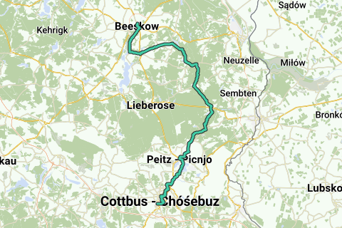 Den tolvte etape af Tour Brandenburg går over 83 kilometer fra Beeskow til Lausitzmetropolen Cottbus. Turen bevæger sig gennem en vidunderlig skov- og sølandskab over Oelsen og Pinnow til Tauer. Gennem området med Peitzer Teiche fortsætter det over Willmersdorf til Cottbus. Længde: 83 km (5 timer) Start: Beeskow Mål: Cottbus Logo / rutevejledning: rød Brandenburg-ørnen på hvid baggrund Ankomst: Fra Berlin Hauptbahnhof med RE1 til Frankfurt/Oder og videre med RB36 (Königs Wusterhausen) til Beeskow (ca. 2 timer). Afrejse: Fra Cottbus med RE2 (Wittenberge) til Berlin Hauptbahnhof (ca. 1,5 timer). Rute: Beeskow, Leißnitz, Friedland, Oelsen, Chossewitz, Reicherskreuz, Pinnow, Tauer, Peitz, Maust, Willmersdorf, Cottbus Seværdigheder: Beeskow: St. Marienkirche, Slot, Regionsmuseum Slot Beeskow: Schaferei oplevelsesverden i AWO Erleblishof Beekow Leißnitz: Leißnitzsee Friedland: Historiske Streleburg Pinnow: Landsbykirke, Badeplads Pinnower See Peitz: Festningstårn, Historisk Rådhus, Evangelisk Sognkirke, Jernværks- og Fiskerimuseum Cottbus: Menneskerettighedscenter og mindesmærke for fængsel, Spreeauenpark, Bymuseum, Wendisk Museum, St. Nikolai Kirke, Spremberger Tårn, Probst- og Sognkirke St. Maria, Fredens Dronning, Brandenburg Apoteks Museum, Kunstmuseum Dieselkraftwerk Kombinationsmuligheder: Oder-Spree-Tour Märkische Schlössertour Schwielochsee-Tour Streicheltour - en oplevelse for store og små Cykelsti Beeskow - Sulecin Mönchstour Schlaubetal-cykeltur Fürst-Pückler-cykelsti Agurk-cykelsti Vandrør / W krainie wody Slot-Guben-Zielona Góra: Floder og landskaber / Rzeki i krajobrazy Niederlausitzer Bergbautour Spree cykelsti Til pyramider og kunstværker i kraftværk Cottbus-Forst (Lausitz)-Zielóna Góra: Slot og haver Ruten kvalitet / ruteudvikling: Turen består hovedsageligt af veludbyggede cykelveje, der overvejende er asfalterede. I mange strækninger er Tour Brandenburg allerede udbygget, skiltet og kan køres på uden begrænsninger. Kort / Litteratur: "Tour Brandenburg: Rundt om Berlin gennem hele Brandenburg", skala 1:75.000, ISBN 978-3850002141, Esterbauer, 3. udgave (2014)