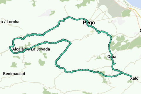 Descobreix-ne tots els avantatgesDu cykler først ad gennemgående veje til Pego, lige efter Sagra er der et lille opstigning. Efter du har passeret Pego via omfartsvejen, er der 23 km opstigning til Margarida (ikke stejlt, gennemsnitligt 3%, maksimalt 8%). Derefter cykler du over et bølgende højland (med kortere stejle stykker op til 12%) og ved den berømte grotte Cova del Rull går det stejlt ned mod Vall d'Ebo. I Vall d'Ebo drejer du til højre og bestiger Pla de Petracos. Stigningen har nogle stejlere passager (op til 16%). Men når du har nået toppen, kommer du ned i et strålende område: vejen flankeres af klipper med huler i. Camino de Pla de Petracos kommer ud til den rolige gennemgående vej Castell de Castells - Benigembla. Herfra er der cirka 20 km gradvis nedstigning til Jalón.