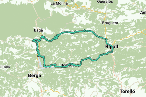 Du krydser dæmningen for at tage endnu en stigning: den lette side af Collada de Vinyoles (kilde: climbfinder) eller se et endnu mere detaljeret klædselprofil. Du ser et gammelt kloster, der står i dæmningen under den første del af opstigningen. Nedstigningen er stejlere end stigningen (se profilen for nedstigningen, som du altså gør fra højre mod venstre). Både stigningen og nedstigningen foregår over stille veje. Langs foden af dæmningen cykler du mod Borredà, og til sidst når du efter 92 km en meget kendt restaurant i denne region: Cobert de Puigcercós. Her kan du spise og drikke, hvis du ikke allerede har gjort det tidligere. Mad og drikke kan også fås på den modsatte campingplads. Efter denne restaurant drejer du til venstre ad en skjult betonvej, som fører dig langs bække Merlès (opstrøms), hvor der er udskåret flere vandbassiner i klipperne med et par små vandfald (som er populære blandt de lokale unge for at søge afkøling). Den betonvej (med godt vejbelægning) fører dig gennem et naturområde.