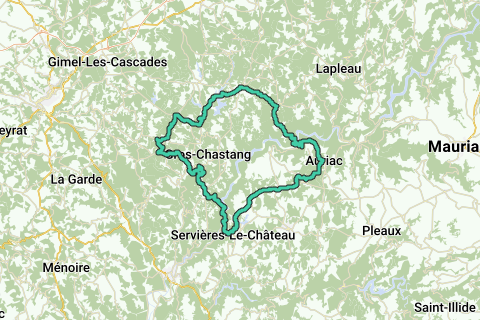 En meget smuk rundtur på landevejscykel, (meget) bakket, der flere gange krydser en dal i den vilde Dordogne, især via den imponerende Chastang-dæmning. Ruten starter i den lille landsby Espagnac, hvorefter den følger Doustre-kløften med fantastiske udsigtspunkter over La Roche-Basse. Derefter krydser den Dordogne ved Chastang-dæmningen, før den klatrer op til landsbyen Servières-le-Château (Côte de Servières). Efter en mere flad sektion til Auriac fører en ret stejl nedkørsel til Pont du Chambon, en hængebro i støbejern. En opstigning på 5 km (Côte des Charbonniers) fører tilbage til plateauet, inden de sidste 20 kilometer afsluttes mere roligt...