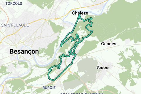 Relativ svær rute med mange stigninger, hvor - bortset fra for de bedste blandt jer - fødderne nogle gange skal sættes på jorden. Jeres anstrengelser belønnes ofte med adskillige udsigtspunkter og opdagelser af kulturarven, såsom det middelalderlige slot og kirken i Montfaucon. Ruten vil give jer smukke indtryk ved den hurtige og tekniske nedkørsel, som lader jer dykke ned i Doubs-dalen i et øjeblik. Endelig tilbyder udsigtspunktet over storbyen Bisontine, Mont Pou.
