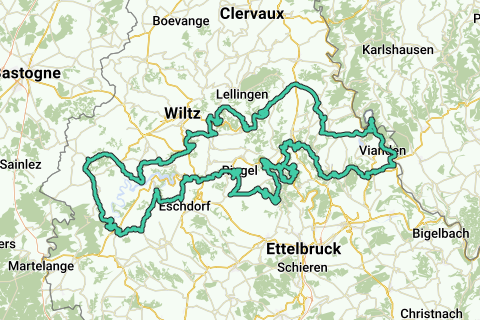 Ruten starter fra Vianden og går langs dæmningen i Our (det Unterbecken) til Bivels (så først et par kilometer relativt fladt).