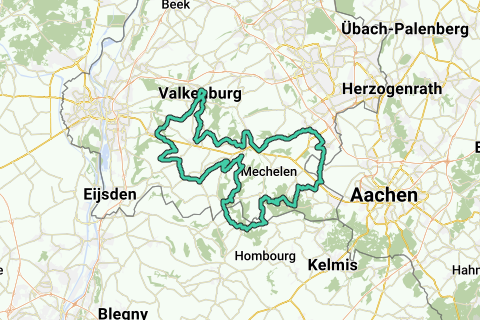 Rundtur Heuvelland 8 fra Vijlen. Start/slut: boscafé 't Hijgend Hert, Rugweg, Vijlen. Stigninger: Smidsberg Epen 1.500 m., max. 7,0%. Rue de Beusdaal Sippenaeken (B) 1.300 m., max. 7,0%. Loorberg Slenaken 1.500 m., max. 8,0%. Oude Luikerweg Reijmerstok 2.400 m., max. 5,0%. Bundersberg Cadier en Keer 1.100 m., max. 10,0%. Sibbergrubbe Valkenburg 2.100 m., max. 7,0%. Plettenberg vest Wittem 1.000 m., max. 6,0%. Harles Vijlen 700 m., max. 9,0%. Rugweg Vijlen 1.200 m., max. 8,0%. Højdemeter: 949. Kaffe stop: Fixed Gear Coffee, Daalhemmerweg 4, Valkenburg a/d Geul (ma/ti lukket).