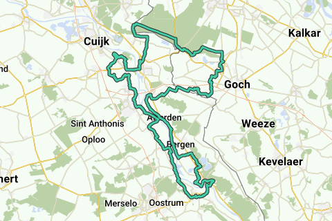 Opdag alle fordeleneTuren starter i Wanssum og går med urviseren. Først cykler du gennem yderområderne ved den vestlige Maasbredde mellem Vierlingsbeek og Boxmeer med enkelte smalle, fritliggende cykelstier, nogle gange omkranset af flethegn (Maasheggen-området). Mellem Vierlingsbeek og Groeningen følger du kort den gennemgående vej, for derefter at cykle tilbage mod Maas ad rolige veje via en gammel flodklit ved Vortum. Du cykler forbi slusekomplekset ved Sambeek og derefter mod Boxmeer og Beugen.