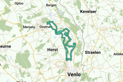 Du cykler næsten straks over grusveje gennem naturområderne Houthuizerheide, Hanenbergerheide og Swolgender Heide til Swolgen. Derefter får du en vekselvis overgang mellem asfaltveje og grusveje, herunder langs en gammel Maasarm (Schuitwater ved Meerlo). Ruten fortsætter over grusveje omkring Meerlo (gennem skovene på Meerlose Heide) mod Godset Geijsteren. Du cykler derefter over grusvejen/skovvejen til Rosmolen (en idyllisk beliggende vandmølle) i Godset Geijsteren.