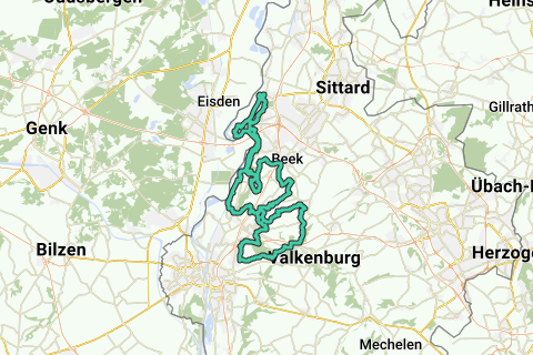 Du befinder dig nu i bakkelandet på denne rute, hvor du først bestiger den smukke Dennenberg , derefter ned ad Biesenberg, bestiger Visweg og ned ad den korte Raarberg. Derefter følger du dalen af Geul med en meget kort stigning (Oliemolenweg). Du cykler langs den østlige kant af Maastricht, og derefter klatrer du op til plateauet, hvor Berg og Terblijt ligger: Kuitenbergweg (i modsætning til hvad navnet antyder, er denne stigning ikke svær). Du daler igen ned i Geuldal og via In de Schreub (Vauwerberg) og Kleverberg klatrer du op til plateauet i Schimmert.