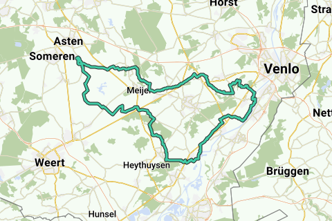 Via Kessel-Eik og landsbyen Spurkt går ruten mod Begijnenberg (en gammel flodbakke) og derefter øst for Baarlo langs Maas. Via slot de Berckt cykler du halvrundt omkring naturreservatet Dubbroek. Derefter går du via landsbyen Rinkesfort til Koningslust. Ruten går videre lige nord for Beringe og øst om Meijel til Neerkant, før den vender tilbage til Heusden.