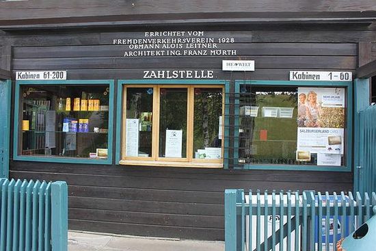 Ein Vorgängerbau wurde 1869 von Heinrich Wallmann errichtet. Das heutige Strandbad mit einem Kabinen- und Buffetgebäude im sogenannten Salzkammergut-Stil wurde im Jahre 1928 vom Fremdenverkehrsverein unter dem Obmann Alois Leitner nach den Plänen des Wiener Architekten Franz Mörth errichtet.