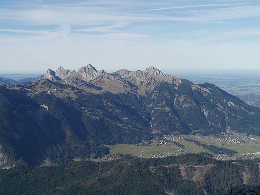 Höchste Erhebungen in den Tannheimer Bergen sind Kellenspitze und Gimpel , die beide von Nesselwängle im Tannheimer Tal gut zu erreichen sind. Weitere Gipfel sind die Gehrenspitze , Rote Flüh , der Schartschrofen , die Schneidspitze und der Kelleschrofen mit dem Babylonischen Turm. Im Norden von Tannheim erhebt sich der Einstein als auffallender, isoliert dastehender Gipfel. Als sehr markanter bayerisch-tirolerischer Grenzgipfel tritt der Aggenstein in Erscheinung.