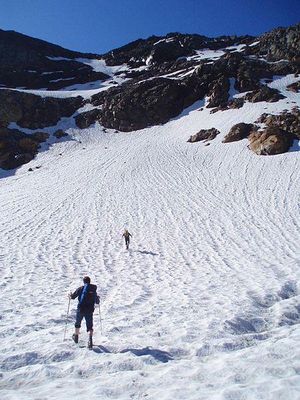 Der Gletscher besteht inzwischen aus mehreren voneinander isolierten Eisfeldern und stellt keine geschlossene Eisfläche mehr dar.