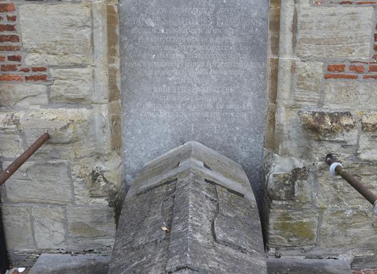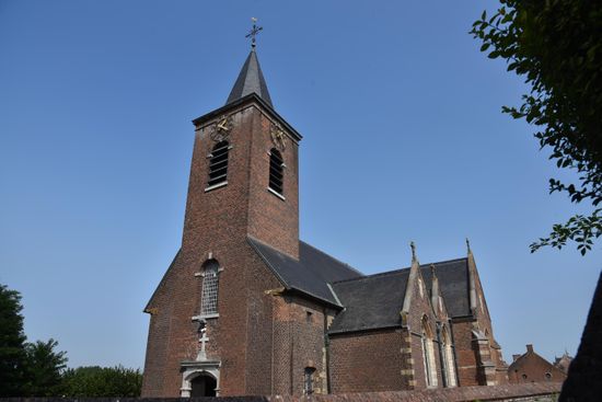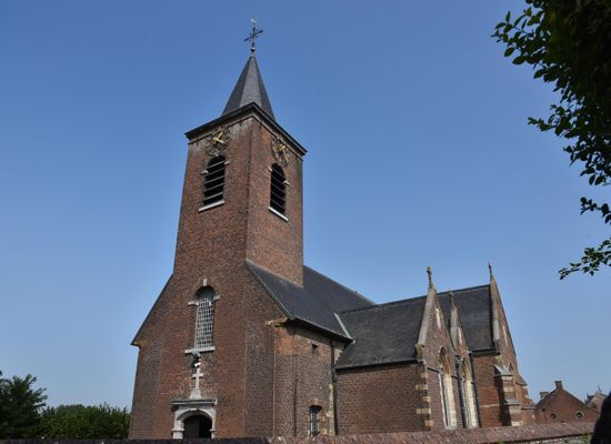 Die Sint-Kristoffelkirche, schön, aber ungewöhnlich auf einem Hügel gelegen. Diese Lage hat alles mit der Verlagerung des alten Dorfzentrums aus der ersten Hälfte des 13ten Jahrhunderts des Stadtteils „Het Hekken“ (jetzt: Nekkersput) zu tun, wo die -bereits lange verschwundene- Sint-Martinuskerk stand, an ihren heutigen Standort. Das ursprüngliche 13te-Jahrhundert-Kirchengebäude, das zunächst isoliert von der Bebauung stand, war eine einschiffige romanische Saalkirche mit einem Chor. Vermutlich im 17ten Jahrhundert wurde die Kirche um zwei Querschiffe erweitert und in der zweiten Hälfte des 18ten Jahrhunderts um ein nördliches Seitenschiff und einen steinernen Westturm ergänzt. Im 19ten Jahrhundert wurde ein zweites Seitenschiff angebaut. Der Grundriss zeigt ein lateinisches Kreuz mit einem quadratischen Westturm, einem dreischiffigen Langhaus, einem hervorstehenden Querschiff und einem Chor mit dreiseitigem Abschluss, flankiert von zwei Sakristeien. In der 1852 umgebauten Westfassade bemerken wir über der Kirchentür noch den Schlussstein mit der Aufschrift „ANNO 1761“. Eine weitere einschneidende Veränderung stammt aus dem Jahr 1858, als ein neugotischer Chor mit Spitzbogenfenstern und einer -nun verschwundenen- Kalvarie, nach Osten ausgerichtet, angebaut wurde. Die vielen Umbauten gaben der Kirche ihr heutiges neugotisches Aussehen. Im Inneren verleiht die Kombination aus Stilen und Materialien dieser Kirche einen besonderen Charme. Auf dem ovalen Friedhof, der das Gotteshaus umgibt, finden wir neben interessanten Grabstätten aus der Zwischenkriegszeit auch ältere und neuere Gedenktafeln an der Kirchenmauer, aber am auffälligsten ist das imposante Grab von Pastor Carolus Boeykens (°1825 - † 1908), ein aus Arduin bestehender Sarg, der in der Nische der abgeschlossenen Leichentür platziert ist.