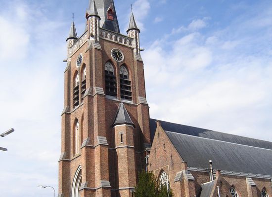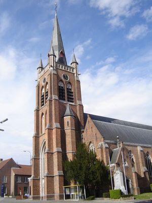 Diese Kirche, die im Laufe der Jahrhunderte bereits einige Umbauten und Änderungen erfahren hatte, wurde während der Bilderstürme von 1579 niedergebrannt. Die Pfarrei war so verarmt und die Gegend so verlassen, dass es bis 1605-1610 dauerte, bis Maximilian von der Woestyne, der Herr der Herrschaft, sie auf eigene Kosten im spätgotischen Stil wieder aufbauen ließ. Es wurde eine prächtige dreischiffige Kirche mit monumentalem Turm über dem Eingang. Die gemauerten Gewölbe im Chor und den Schiffen, durchzogen von Rippen und Quergurten, verliehen ihr ein einzigartiges Aussehen.