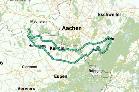 Start/Ziel: Gasterij de Zegelskoel, Heijenratherweg 22, Slenaken-Heijenrath. Anstiege: Kasteelstraat Teuven (B) 1.200 m., max. 10,0%. Rue de Lattenheuer Plombières (B) 1.100 m., max. 9,0%. Belle-Vue Plombières (B) 1.200 m., max. 10,0%. Rue de Moresnet Morenet-Chapelle (B) 900 m., max. 6,0%. Grossenbusch (teilweise) Hauset (B) 550 m., max. 5,0%. Auf dem Acker Breinig (D) 1.700 m., max. 9,0%. Mulartshütter Strasse, Mulartshütte (D) 700 m., max. 10,0%. Hahner Strasse Hahn (D) 600 m., max. 6,0%. Marienthalstrasse Raeren (B) 1.000 m., max. 6,0%. Rue de Hombourgh Montzen (B) 2.100 m., max. 7,0%. Gieveldstraat Teuven (B) 1.500 m., max. 6,0%. In der Route gibt es auch mehrere namenlose Anstiege. Höhenmeter: 1.034. Kaffeepause: Restaurant Birkenhof, Mulartshütterstrasse 20, Stolberg (D) (montags geschlossen).