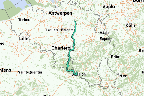 Dies ist die Route des ersten Tages. Abfahrt in Aarschot(BE) mit Ankunft in Bouillon(BE)