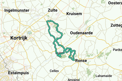 Diese Tour bietet eine Reihe alternativer Anstiege anstelle der bekannten klassischen Anstiege wie Kluisberg, Paterberg und Kwaremont. Wir fahren die Rückseite des Tiegemberg in Richtung Avelgem nach Kluisbergen hinauf. Dort fahren wir eine unbekannte steile Straße hinauf in Richtung Kluisberg. Danach fahren wir in Richtung Kwaremont, um die Abfahrt des Paterbergs (die Stooktestraat) zu erklimmen. Danach fahren wir einen langen Anstieg in Richtung Hotond. Anschließend fahren wir die große Straße hinunter in Richtung Ronse. Als (teilweise) Alternative zur Karnemelkbeekstraat fahren wir die Cote de Russeignies. Eine schöne, ruhige, schmale Straße, die uns an die Seite der Karnemelkbeestraat bringt. Danach geht es schnell bergab in Richtung Fuß des Paterbergs. Diesen lassen wir rechts liegen und etwas weiter biegen wir links ab, um die kassenfreie Seite des Kwaremont zu nehmen. Danach fahren wir den neuen Kwaremont hinunter und über die Brücke über die Schelde fahren wir auf kleinen Straßen nach Tiegem. Hier entscheiden wir uns für die klassische Seite des Tiegemberg, fahren aber links in den Wald, um einen kurzen steilen Hügel zu bezwingen. Zum Abschluss fahren wir noch die Holstraat in Anzegem hinauf und machen noch ein letztes "Nick" zur Alten Brennerei in Wortegem.