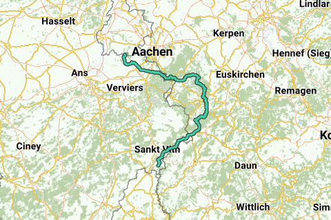 Burg Reuland – Bracht – Lommersweiler – Schlierbach – Atzenrath – Andlermühle – Manderfeld – Berterath – Hergersberg – Scheid – Frauenkron – Berk – Etscherath – Schwalenbach – Wolfert – Oberschömbach – Kreuzberg – Hecken – Benenberg – Sistig – Frohnrath – Broich – Wintzen – Olef – Gemünd – Wolfgarten – Hasenfeld – Scheidbaum – Schmidt – Rollesbroich – Lammersdorf – Vennbahn – Petergensfeld – Neudorf – Belven – Walhorn – Lontzen – Busch – Montzen – Hombourg – Merkhof – Hagelstein – Rode Bos – Voeren.
