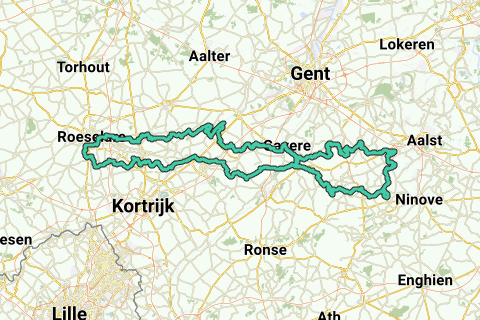 Nach dem Start geht es in Richtung Lendelede, Desselgem und hier bleiben wir ein Stück entlang der Leie bis nach Sint-Eloois-Vijve, um von hier aus in Richtung Nokere zu radeln, aber wir nehmen nicht die klassische, sondern eine etwas alternativer Route bis nach Ooike. Danach geht es über Hermelgem in die Vlaamse Ardennen, von Sint-Maria-Latem und über die Kortendries steigen wir in Sint-Goriks-Oudenhove ein. Kurz darauf bekommen wir die Vlamme unter die Pedalen und es geht über die Pijpketel in Richtung Wijnhuize, um über Steenhuize-Wijnhuize entlang der Ransbeekstraße Sint-Antelinks zu betreten. Ab dann radeln wir nach Norden über Roesselare (ja, genau), nach Aaigem und von hier aus kehren wir zurück über Borsbeke, Sint-Lievesn-Houtem, Balegem und über Elleve geht es wieder nach Hermelgem, von hier aus radeln wir entlang der Bovenschelde bis nach Gavere. Danach nach Lozer, dann in Richtung Olsene und auch hier bleiben wir ein Stück entlang des linken Ufers der Leie, um unseren Weg nach Oostrozebeke fortzusetzen, über die Paanders geht es nach Meulebeke und von hier aus nach Kachtem, um über das Rhodesgoed, Rumbeke zu fahren und so in Roeselare anzukommen.