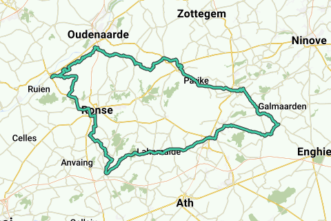 Fahrt von Kluisbergen zur Mauer in Geraardsbergen. Weiter in Richtung Enghien, um über Lessines zurück nach Ronse und Kuisbergen zu fahren.