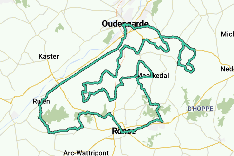 Fahrt von Oudenaarde über einige schöne Anstiege, unter anderem: Kluisberg, Karnemelkbeekstraat, Kanarieberg, Donderij, Taaienberg, Paterberg, Korte Keer, Ladeuze, Kapelleberg, Boigneberg, Foreest und Steenberg.