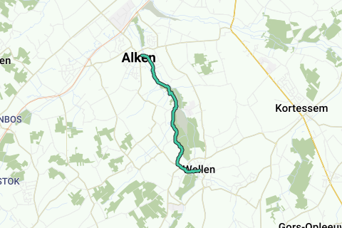 Wanderweg über Fußwege und langsame Straßen von Alken nach Wellen durch das schöne Herkvallei in der Haspengouw-Fruchtregion.