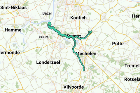 Zurück zu deinem Ausgangspunkt? Nimm den Zug, wenn du müde bist. Oder folge einem schönen Weg entlang der Eisenbahnlinie 25 Brüssel-Antwerpen: https://www.routeyou.com/route/view/412415/fietsroute-stations-weerde-duffel-via-spoorlijn-25.nl (16 km), insgesamt 64 km.