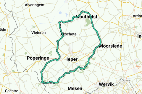 Diese Route beginnt und endet in: Heulegoedstraat, 8650 Houthulst. Gesamter Anstieg: 298 m. Eine schöne Herausforderung für diejenigen, die vor ein wenig Milchsäure keine Angst haben.