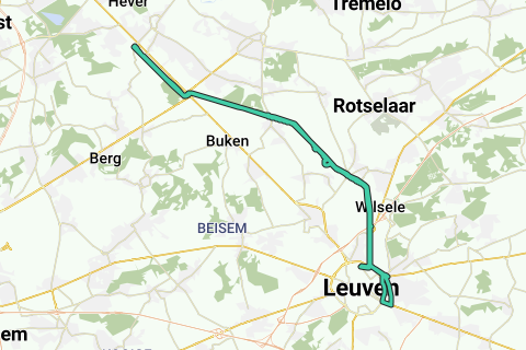 Abfahrt vom Knotenpunkt 77 in Boortmeerbeek auf dem rechten Vaartdijk in Richtung Leuven und weiter nach Kampenhout-Sas (Bootsfahrten), Tildonk-Sas, der Umweg um Cargill, der Remyturm (gegenüber), das hippe Havenkom von Leuven (auch ein Umweg wegen Straßenarbeiten), die Umgebung des Leuvener Bahnhofs, das Provinzhaus, das Tiense Tor.