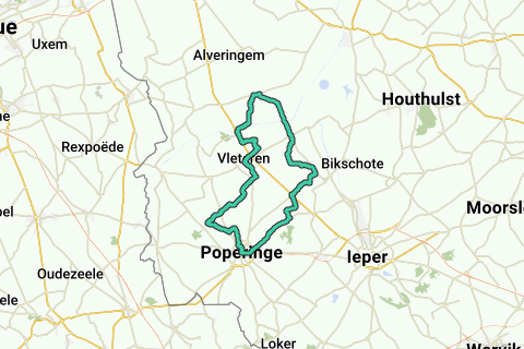 Entdecken und probieren in der Westhoek. Beginnen Sie in Poperinge. Es gibt einige längere Strecken entlang belebter Straßen, aber dafür gibt es schöne Radwege, die ordentlich von der Hauptstraße getrennt sind.