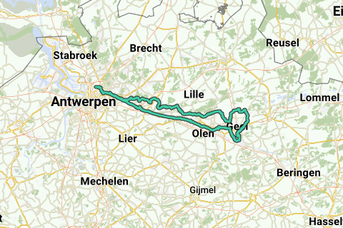 Merksem-Wijnegem-Grobbendonk-Herentals-Olen sluizen-Lammerdries-Larum-Winkelomheide-Tenaard-Roerdomp-Herentals-Vorselaar-Pulle-Pulderbos-Zandhoven-Oelegem-Wijnegem-Merksem