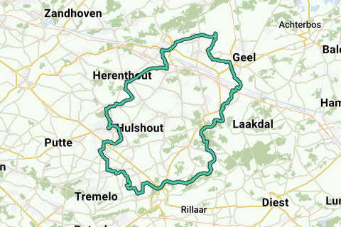 Fahrradroute für Rennräder durch die Zuiderkempen. Die Route beginnt in Geel-Zammel und führt über Herselt, Aarschot, Baal, Heist op den Berg, Herentals und Geel.