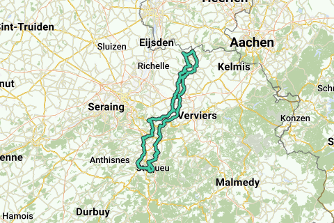 S.M.V. – S.P.V. – ∆ Magis – St.-Jean-Sart – Val-Dieu geradeaus – ∆Wadeleux – Richtung Charneux – rechts, links – N627 links, rechts – Herve – José – Wegimont – N621 überqueren ∆ – rechts Richtung Olne – Forêt – Prayon – Gomzé-Andomont – ∆ Gomzé – N30 links – rechts Ogné – Sprimont – ∆ Rouvreux – Martinrive – ∆∆ (côte de Chambralles) Awan – N86 links – N30 rechts – links ∆∆ côte de Niâster – Aywaille – Dieupart – Sougné-Remouchamps ∆∆ (La Redoute) – ∆ Hot’champs – Cornémont – Louveigné – Fraipont – Nessonvaux – ∆ Soiron – ∆ Xhendelesse – Manaihant – ∆ Herve – Bouxhmont – Fastré – Champiemont – N642 rechts – N650 überqueren – ∆ Gorhez – Aubel – ∆ Hagelstein – De Plank - S.M.V.