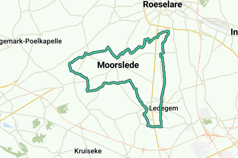 Ignoriere alle Nebenszenen und fahre weiter zwischen Wiesen, Gemüsebau und an einem kleinen Wald vorbei. Die Landschaft wird wieder sanft gewellt. Biege dann rechts in die Teerlingweg ein und fahre an Metalconstructies Vandervelde bis zur T. Links ab. Du fährst an einem Hof mit einer angebauten Kapelle vorbei, lässt eine Nebenstraße mit einem Spiegel rechts liegen und fährst weiter an Gewächshäusern bis zur T. Rechts ab bis zur Vorfahrtstraße mit dem Agglomerationsschild von Moorslede. Wieder rechts ab, vorbei am Ende des Agglomerationsschilds Moorslede und über den Kreisverkehr links ab, in Richtung Moorslede. Du fährst erneut an einem Agglomerationsschild von Moorslede vorbei und folgst der breiten Straße mit auf jeder Seite einem gestrichelten Radweg bis ins Dorf Moorslede. Biege dort rechts in die enge Diepestraat ein. Nach ein paar Häusern und dem Ende des Agglomerationsschilds von Moorslede fährst du zwischen den Gemüsefeldern hinunter mit einer wunderschönen Aussicht vor dir. Lasse auf KP 75 einen Weg links liegen und fahre geradeaus in Richtung KP 5.