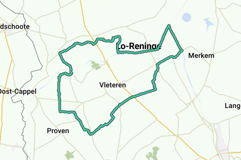 Überquere die N8 und setze deinen Weg durch die offene Agrarlandschaft fort. Ignoriere links die Keiweg und biege an der T-Kreuzung rechts ab und direkt danach links. Du fährst jetzt über einen schmalen Betonweg, ignorierst rechts die Sperlakenstraat und links die Bulskampstraat und fährst weiter zwischen Wiesen und Feldern. Lass die Sint-Corynstraat links liegen und biege an Knotenpunkt 73 links ab. Folge der Woestenstraat bis Knotenpunkt 91. Wähle dort Richtung Knotenpunkt 5. Diese Straße heißt ebenfalls Woestenstraat. Folge dem gewundenen Weg bis zu einer Vorfahrtsstraße. Überquere diese und fahre über die malerische Peperstraat bis zur Kirche von Reninge. Vor der Kirche rechts und dann links daran vorbei bis zur T-Kreuzung.