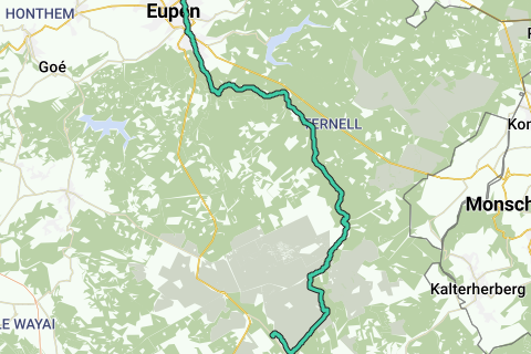 Über die Brücke folgen wir dem GR über den breiten Waldweg nach rechts und erreichen bald die ersten Gebäude von Eupen. Wir folgen der Hutte-Straße und der Gulcherstraße, biegen links auf die belebtere Schilsstraße (N67) zum Kreisverkehr an der Malmedyerstraße und der Haasstraße ab.