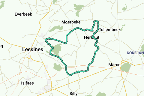 2. Fahre durch die Zullikstraat, über die Autobahn, in die Rue de Manhove. Am Ende der Straße, an der T-Kreuzung, biege nach rechts ab und halte rechts in der Rue Warsbecq. Geradeaus fährend entlang von Feldern und Wiesen bringt dich der Asphalt zu einem Grenzstein aus dem Jahr 1767. Der Stein und ein französischsprachiges Informationsschild stehen links von der Straße. Zurück in der bewohnten Welt nimmst du die erste Straße rechts, die Rue du Monument. An der T-Kreuzung nach links, die Rue de la Rembeck nehmen. Du kommst dann in die Kurve der rue de Grammont (N263), der du nach links folgst. Achtung: Vorfahrtsstraße! Folge weiterhin der Richtung Hellebecq bis du rechts in die Rue du Bois einbiegen kannst. Bald tauchst du unter der Autobahn hindurch. Fahre bis zur Kreuzung, die du quer überquerst, um auf der anderen Seite (ein wenig nach links) weiter durch die rue du Bois zu fahren. Weiter die rue du Bois entlang (keine Straßenschilder) nicht nach links abbiegen, sondern bleibe geradeaus treten durch die rue D’Horlebaix. Am Ende einmal links abbiegen und dann nach rechts. Einige Meter weiter gabelt sich die Straße. Fahre links in die rue De Gage. Du fährst durch den Wald und vorbei am Schloss d’Yve, benannt nach seinem Bewohner, dem Marquis d’Yve. Vorbei am Schlossgelände siehst du die Chapelle Saint-Joseph auf dem Feld. Vorbei am Schloss und dem Gelände fährst du geradeaus, bis du rechts in die rue Gilles einbiegst. Zuerst fährst du ein Stück entlang des Randes des Bois d’Acren hinunter, dann beginnst du wieder zu steigen und bekommst links einen Blick auf die beeindruckenden Carrières de l’Ermitage. Dieses porphyrhaltige Steinbruch ist besonders im Herbst und Winter sichtbar, wenn es wenig Grün an den Bäumen und Sträuchern gibt. Du steigst durch eine wunderschöne, beeindruckende Buchenallee zur Ferme du Buse. Folge noch ein wenig der Rue Gilles durch den Wald und halte dann links in der Rue Glacenée. Wenn du aus dem Wald bist, sieht es so aus, als ob Nebel hängt, es ist jedoch Staub vom Steinbruch. An einer Gabelung (in Deux-Acren) folgst du der Rue Glacenée nach rechts. Kurz bevor du in den Ortskern von Deux-Acren gelangst, lenkst du scharf nach rechts in die Rue D’En-Bas. (Du kannst auch ein Stück weiter an dem Parkplatz rechts der Straße nach rechts in die rue D’En-Bas einbiegen). Diese Straße weiterhin nach rechts (eigentlich geradeaus) folgen. Einige Male in die Pedale treten und dann nach rechts abbiegen, nach Akrenbos. Die Straße heißt hier immer noch Rue D’En-Bas.