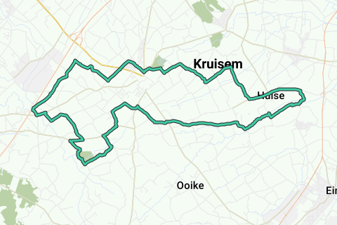 3. An der nächsten T-Kreuzung nach links, die Lindeknokstraat. Am Ende rechts der Waregemstraat folgen bis zur nächsten Kreuzung, wo du links in die Nokersedorpstraat fährst. In Nokere fährst du an der romanischen Kirche vorbei nach unten bis zur Spichtestraat rechts. Diese folge dort zur Vijverdamstraat rechts, wo du einen schönen Blick auf das klassizistische Schloss hast. An der Gabelung folgst du der Vijverdamstraat links weiter. Am Ende biegst du scharf nach rechts ab. Du fährst jetzt in der Waregemsestraat, die du ein Stück weiter überqueren musst, um links in die Oude Molenweg abzubiegen. Am Ende überquere schräg nach rechts in die Bredestraat. Trete geradeaus bis du in einer Kurve nach links in die Zaubeekstraat fährst. Weiter folgen bis vor das Rückhaltebecken. Hier fährst du rechts in den Sandweg. Am Ende folgst du der Waregemsteenweg nach links. Vor der Brücke biegst du rechts in den Kopfsteinpflasterweg neben Schloss Herleghem ab, mit Teich und Wasser - Mühle. Wo der Kopfsteinpflasterweg nach rechts abbiegt, fährst du geradeaus in die Spinnewielstraat, parallel zur Straße, die die Grenze zwischen dem Industriegebiet und der schönen sanften Landschaft bildet. An dem dreieckigen Platz gehst du kurz links und dann rechts in die Dertienveldekensweg. Du fährst in die erste Straße rechts, die Riemegemstraat. An der T-Kreuzung fährst du rechts in die IJzerbergstraat und dann links, wieder in die Riemegemstraat, bergauf. An der T-Kreuzung fährst du links in die Groenenweg. Bleibe geradeaus, überquere die Kreuzung mit der manchmal sehr belebten Olsensesteenweg und weiter geradeaus in die Straße, die immer noch Groenenweg heißt. Trete über die Kreuzung mit der Knokstraat und an der nächsten Gabel fährst du rechts in die Beverhoekstraat. Von hier siehst du die Kirche von Kruishoutem, die du geradeaus über die Brug- und die Kerkstraat erreichst.