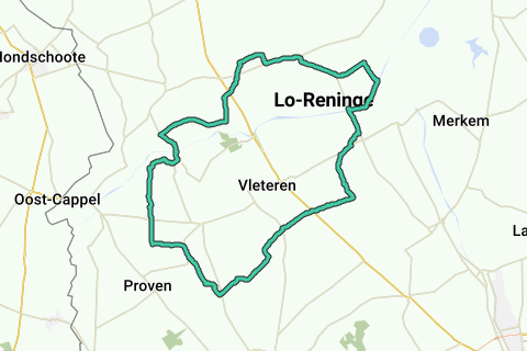 1. Treffen auf dem Markt in Lo. Abfahrt mit dem Rathaus (1566), jetzt Restaurant, zu deiner linken Seite. Halte den Platz mit der alten Stadtpumpe und dem Vatevijver (Wasserreservoir bei Brand, bereits 1404 erwähnt) zu deiner rechten Seite und fahre am Kloster der Grauwschwestern (mit gotischer Kapelle aus 1497) in die Zuidstraat. Die Straße führt dich aus dem Zentrum in eine offene Agrarlandschaft. Folge der Straße, bis sie eine Rechtskurve macht. Hier gehen zwei Wege nach links ab. Nimm den zweiten, den Reningesteenweg, rechts steht eine Stromkabine. Überquere die Grote Beverdijkbeek und fahre entlang einer Feldkapelle. Gleich nach dem Hof Ter Walleboom steht die Kapelle von O.-L.-Vrouw-van-de-IJzer unter einem Baum. Direkt an der Kapelle rechts in die Straße Pereboom bis zur IJzer. Biege rechts zum Reningebrug – gerade links über die Brücke und dem Radweg folgen. Dort überquerst du den Fluss und kreuzt etwas weiter die Boezingegracht. An der ersten kleinen Kreuzung biegst du rechts in die Broekstraat ein. An der T nach rechts (Oostvleterenstraat) und dann nimmst du die erste links, die Hoflandstraat (weiter vorne Woestenstraat). Folge dieser bis zur ersten Viersprung und nimm hier die Nieuwstraat nach rechts. Ignoriere alle Seitenstraßen und fahre durch eine Agrarlandschaft bis zu einer T-Kreuzung (Halve Reningestraat). Kurz nach rechts und direkt links in die Kruisboomstraat. Folge dieser bis zur Straße Veurne–Ieper. Überquere diese und folge der Kruisboomstraat auf der anderen Seite weiter. An der ersten kleinen Kreuzung überquerst du, fährst am Vleterhof vorbei, ignorierst eine Straße rechts und kreuzt die Poperingse Vliet. An der T kurz links und dann direkt rechts. Du folgst jetzt der Zwijnlandstraat in Richtung St.-Sixtusabtei.