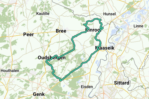 Du verlässt die Station von Kolenspoor in (V) As Richtung 40 und fährst vorbei am 31 m hohen Aussichtsturm, einer Replik der ersten Bohrinsel, auf der 1901 hier Steinkohle gefunden wurde. Im Wald fährst du entlang der Schmalspurbahn der Miniaturbahn. Zurück in der bewohnten Welt folgst du der Driebankenstraat nach rechts. Überquere die Stationsstraat und fahre entlang des Cafés Rozenhof durch die Schuttenbergstraat bis zum Knotenpunkt 40. Fahre geradeaus weiter in Richtung 39. Über die Ziepstraat erreichst du die André-Dumont-Straße und folgst dieser nach rechts, bis du links in die Vlasroot einbiegen kannst. Sofort danach nimmst du rechts die Kantonale Baan. An der Gabelung bei der Schutterij Sint-Sebastiaan As bleibst du links und fährst über die Meeuwerweg bis zum Knotenpunkt 39. Fahre weiter geradeaus in Richtung 70. Biege mit dem breiten Radweg nach rechts und dann nach links. Weiter kommst du in eine Industriezone und fährst über einen separaten Radweg bis zur Straße nach Zwartberg, am Knotenpunkt 70. Kurze rechts abbiegen in Richtung 33 und dann links in die Industrieweg Noord und anschließend rechts in die Nijverheidslaan. Biege links ab und fahre am Ende geradeaus auf den Radweg neben dem breiten Waldweg. An der Waldrand links abbiegen und nach ein paar Kurven fährst du weg von der Industriezone. Du fährst über die Ophovenerheide und gerade an dem Schild Wijshagen vorbei kommst du an einem Teich mit einem Picknickplatz vorbei. Weiter durch den Ophovenerwald, entlang des Waldes und durch den Wald bis zum Knotenpunkt 33. Fahre weiter geradeaus in Richtung 34. Kreuze durch den Wald bis zum Knotenpunkt 34 mit Infosäule. Rechts abbiegen, Richtung 35, über einen schmalen Asphaltweg zwischen Feldern und Wiesen. An der kleinen Kreuzung mit Venhoven rechts abbiegen und an einem Picknickplatz links abbiegen, erneut über einen Radweg neben einem Feldweg. Überquere die N730 und fahre weiter geradeaus. Vorbei an der Selbsternte der Heidelbeerplantage 1 und dann in den Wald. Du kommst vorbei an der Kapelle der O.-L.-V. von Ruhe und ignorierst den Weg nach Gruitrode links. Am Knotenpunkt 35 geradeaus in Richtung 36. Lass den Weg nach Neerglabbeek links liegen und überquere weiter die N771 über eine kleine Brücke für Radfahrer. Weiter hügelig bis du an einem kleinen Kreuzung mit dem Radweg nach links biegst. Überquere einen gefährlichen Übergang und steige mit einer kurzen Knick aus dem Wald. Kurz zurück in den Wald und dann darfst du spektakulär durch eine offene Landschaft absteigen und vorbei an der Hof Den Hauw zurück zur bewohnten Welt. Von Itterbeek nach Zuid-Willemsvaart An der ersten Kreuzung geradeaus in die Caubergstraat und vorbei am Brouwershuis und der Brauerei Sint-Jozef bis zum Itterplein mit dem Clijstersfontein 2. Hier links in die Opstraat, entlang eines Platzes bis zum Knotenpunkt 36. Dort rechts abbiegen, Richtung 11, über die Itterbeek und vorbei an einer Schule bis zur Itterkiezel. Überquere und folge der Pastoor Neyenslaan, Richtung 11, vorbei am alten Pfarrhaus und weiter über einen Weg für Radfahrer und Wanderer entlang der Itterbeek. An einer T-Kreuzung vor der Brücke links abbiegen bis zum Knotenpunkt 11. Fahrrad über die Brücke über die Zuid-Willemsvaart und du bist schon am Knotenpunkt 12. Folge dem Kanal kurz nach rechts, in Richtung 14. Bei Café De Kieper links abbiegen, bis ins Zentrum von Tongerlo. Biege neben der Kirche rechts in die Solterweg und dann links in die Schansstraat. Über die Groenstraat fährst du Tongerlo wieder hinaus. An der Ecke mit der Heilige Ritakapel aus 1979 nimmst du links die Diekerstraat und fährst entlang eines Wäldchens und Wiesen bis zur vielbefahrenen Breeërsteenweg. Überquere und fahre weiter durch die Belestraat bis zur Kreuzung mit der Mariakapelle. Folge links der Broekstraat bis zum Knotenpunkt 14. Geradeaus, Richtung 15, über einen Weg für Landwirtschaftsfahrzeuge, Wanderer, Radfahrer und Reiter. Du überquerst Broekziep und folgst dem Waldrand bis du rechts über eine kleine Brücke den breiten Bach überqueren kannst. An der ersten Kreuzung, mit dem Knotenpunkt 15, rechts abbiegen, Richtung 16. An der Gabelung links in die Winkelstraat, zwischen Feldern und Wiesen bis zum Knotenpunkt 16. Geradeaus, Richtung 17, vorbei an der Zorgvlietmolen 3 bis zur Weertersteenweg. Überquere und fahre weiter vorbei an der Kirche von Molenbeersel. Du kommst vorbei an der Pfarrei Sint-Isidorius, einer Schule und der Keijersmolen 4. Überquere eine kleine Kreuzung, ignoriere die Seitenstraßen und fahre vorbei an der Schreyvenkapelle aus 1845. An der Gabelung bleib rechts. Folge Grootbeersel, ignoriere die Looverstraat rechts und erreiche den Knotenpunkt 17. Wähle rechts die Uffelseweg, Richtung 18. Der Dodendraad An der Gabelung links, Richtung Dodendraad 5. Über einen Kiesweg kommst du zu Grenzstein 146 mit der Ruine des Schmugglerscafé Kempkes und einer historischen Rekonstruktion des „Dodendraads“ aus dem Ersten Weltkrieg (siehe die Decke eines überdachten Picknickplatzes). Rechts um das Gelände und weiter vorne an einem Feldkreuz links in die Bekerstraat. An Grenzstein 144 überquerst du den Aabeek und fährst vorbei an dem Bekerhofje mit Parktieren. An der Kreuzung nach Grenzstein 143 links abbiegen und der Keyersstraat folgen. Du fährst vorbei an Grenzstein 142 und biegst an der Kreuzung links in die Manestraat rechts ab, entlang der Milchviehhaltung Timmermans und dem Diepven. Kurz nach Grenzstein 140 kommst du am Knotenpunkt 18. Links abbiegen, Richtung 19. Überquere die Itterbeek und nimm an der kleinen Kreuzung links die Dolenweg. Nach einem Hof mit einem Informationsschild über den Anbau von Lauch kommst du zum Knotenpunkt 19. Rechts abbiegen, Richtung 28, durch ein Wohnviertel. An dem Tearoom ’t Stampertje links abbiegen, bis du zum Café De Schürzenjäger an der Breeërweg kommst. Überqueren und weiterdiesen offenen Landschaftsweg fahren. Ignoriere die Abzweigungen
