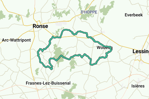 Hohle Wege und Panoramen Der Weg wird erneut hohl und du kommst an eine T-Kreuzung. Jetzt rechts ab, zwischen den landwirtschaftlichen Betrieben bis zu einem kleinen Kreuzungsbereich mit der Rue du Dieu des Monts. Überquere die Straße und fahre weiter entlang des Waldrandes und dann durch den Wald. Der Weg wird kurz wieder hohl und an der Kreuzung mit einer unbefestigten Straße geradeaus vor dir, biegst du links ab und fährst weiter auf einer breiten asphaltierte Straße. Wenn du den Wald verlässt, fährst du am Ortsschild von Frasnes-lez-Buissenal vorbei und weiter bis zur ersten Kreuzung. Nimm rechts die Rue Hoguenne und beginne einen steilen Anstieg. Für eine unbefestigte Straße biegst du nach links und dann nach rechts. Du bleibst noch eine Weile am Steigen, machst eine große Kurve durch die Landschaft, ignorierst zwei Nebenstraßen rechts und kommst an einen kleinen Kreuzungsbereich mit links einer Sackgasse und rechts der Rue des Monts. Genieße das Panorama und achte auch kurz auf die Kapelle auf der linken Seite, bei dem halbhohlen Weg. Halte an der nächsten Abzweigung links an. Du fährst durch einen halbhohlen und dann hohlen Weg bis zur T-Kreuzung. Links ab und genieße ein gigantisches Panorama. Ignoriere eine Straße rechts und nimm an der nächsten Kreuzung die Rue Bleurieu nach rechts. Du steigst an einigen Bauernhöfen vorbei ab und steigst dann bis zur ersten Vierwege-Gabelung. Gegenüber eine Heiligenstatue ohne Kapelle und rechts eine alte Kapelle. Hier rechts ab. Dieser Weg heißt ebenfalls Rue Bleurieu. An der Gabelung lässt du die Rue Delfosse rechts liegen und fährst geradeaus, ebenfalls Rue Delfosse. Du beginnst einen steilen Anstieg. Die Rue Delfosse biegt rechts ab, du fährst geradeaus in die Rue de la Croisette. Biege mit diesem Weg nach links ab, steige zwischen zwei Bauernhöfen hindurch und kommst auf einen anderen Weg, den du nach rechts folgst. Auch dieser Weg heißt Rue de la Croisette. Nach einer kurzen Biegung kommst du an einen kleinen Kreuzungsbereich und kannst wieder ein beeindruckendes Panorama genießen. Überquere die kleine Kreuzung, kümmere dich nicht um die Nebenwege und fahre bis zur Kirche von Saint-Sauveur ab. Vor der Kirche links ab bis zur T, rechts ab, Richtung Renaix. Folge der Rue des Combattants bis du an der Gabelung links in die Rue Emile Deltenre einbiegen kannst. Nimm dann an dem kleinen Kreuzungsbereich rechts die Rue Bailly und ziehe wieder in die offene Landschaft hinein. Rund um den Mont-St-Laurent Rechts liegt der Mont-St-Laurent. An einem weißen Haus aus dem Jahr 1880 nimmst du rechts die Rue de la Tour Notre-Dame. Am Ende des Weges, an einem Haus aus dem Jahr 1870 und einem Feldkreuz, machst du eine scharfe Kurve nach links und folgst der Rue de Martinsart. Du fährst um den Mont-St-Laurent und hältst an der ersten Gabelung links an. Weiter kommst du in die Biegung eines Weges. Fahre noch 100 m geradeaus und nimm an der nächsten Abzweigung rechts die Rue de l’Etanque. Folge dieser bis zum Ende. Links ab, biege nach rechts und überquere den Sint-Martensbeek. Rechts von der Straße heißt er Ruisseau Saint-Martin. Du bist jetzt an der Sprachgrenze und fährst in die Provinz Ostflandern. Vorbei an einer Kapelle und einigen Bauernhöfen ignorierst du die Hoogdeurnestraat rechts und fährst weiter durch die Deurnestraat bis zur nächsten Gabelung. Nimm rechts die Albert Demanezstraat bis zum Ende. Rechts ab in die Maquisstraat für einen steilen Anstieg und an der ersten kleinen Kreuzung folge links der Kleinen Heidestraat bis zur Elzeelsesteenweg. Überquere diese und fahre schräg rechts in die Kattemolenstraat. Am Ende des Weges steht die Moulin du Cat Sauvage oder die Kattenmolen 4 auf einem Hügel. Du bist zurück in Hennegau und stehst an der N57. Biege links ab und fahre direkt nach Crimont. An der ersten Kreuzung mit einem Kreuz fährst du geradeaus und das machst du auch an der zweiten. Lass danach eine kleine Straße links liegen und nimm gegenüber Haus Nr. 48 den Weg rechts. Cinquant 1-44 steht auf dem Straßenschild. Kümmere dich nicht um Nebenstraßen und steig ab in Richtung der Kirche von Ellezelles. Kurz hinter dem Agglomerationsschild von Ellezelles biegst du nach rechts ab und vor einem Bauernhof nach links. Ignoriere dann eine Straße rechts und nimm die erste Straße links, entlang einer hohen Mauer und dem Friedhof von Ellezelles bis zur N519. Links ab. Paradiesisch Nimm danach die erste Straße rechts, die Rue de Guinaumont, Richtung Brasserie Ellezelloise 5. An der ersten Gabelung wähle rechts Bruyère. Wer die Brauerei besuchen will, muss hier 400 m nach links radeln. Du fährst durch einen hohlen Weg und musst wieder steigen. Kümmere dich nicht um Nebenstraßen, überquere einen kleinen Kreuzungsbereich und halte an einer Gabelung mit links einer Sackgasse rechts an, mit wieder einer schönen Aussicht. Ignoriere noch eine Sackgasse rechts und fahre an einer Kapelle vorbei. An der nächsten Kreuzung, ebenfalls mit einer Kapelle, rechts ab. Links steht das Ortsschild von Flobecq-Vloesberg. Du folgst rechts Bruyère, mit 'Circulation locale'. Sofort danach kommst du an einen kleinen Kreuzungsbereich mit geraden und rechts unbefestigten Wegen und einer Kapelle. Hier links ab. Danach biegst du mit dem Weg nach rechts ab und ignorierst eine Sackgasse links. An der Gabelung mit einem unbefestigten Weg biegt du mit der Asphaltstraße nach links ab. Paradis heißt die Straße jetzt, und mit den schönen Ausblicken ist der Name gut gewählt. Du kommst an die N57, überquerst diese und fährst immer noch durch Paradis. Ignoriere rechts einen unbefestigten Weg und fahre weiter durch Anais, vorbei an zwei großen Höfen bis zu einem T mit einer Kapelle. Rechts ab und an der nächsten Kapelle links in Quatre Chemins. Du querst zwei kleine Kreuzungen und die Quatre Chemins geht in die Rue Georges Dubreucq über. Radle am Friedhof vorbei bis zur Place de Wodecq.