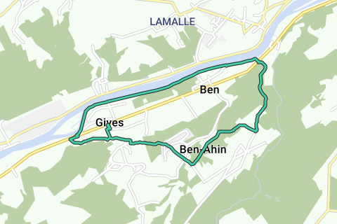 Bevor du losgehst: denk an passendes Schuhwerk bei Regenwetter. Stiefel sind dann kein überflüssiger Luxus. Treffen am Place des Manants de Gives (V), neben der Kirche von Gives. Gehe entlang der Rückseite der Kirche bis zur Rue Emile Vandervelde und folge dieser nach links. Ignoriere links die Rue des Prés Brion und gehe an der ersten Gabelung links. Du steigst sanft, ignorierst rechts die Sackgasse Rue de la Petite Ruelle und genießt das Panorama des Maastals vor dir. Rechts abbiegen und dann links mit einer scharfen Kurve in eine absteigende, endende Straße neben einem Haus gehen. Die Straße geht über in einen schmalen Fußweg mit einem roten Rautenmuster als Wegweisung, rechts vom Drahtzaun. Du steigst zwischen den Wiesen bis in den Wald und folgst den roten Rautenmuster bis du zwischen den Gärten eines Villenviertels an eine Straße kommst. Überquere diese und gehe weiter über einen schmalen Pfad zwischen den Gärten bis zu einer nächsten Straße. Quere diese und gehe erneut über einen Pfad zwischen Gärten bis zu einer Wiese mit einem Schlagbaum. Gehe durch die Wiese zu einem ähnlichen Schlagbaum auf der anderen Seite und folge dem roten Rautenmuster und einem blauen Rechteck bis du neben einem Haus auf einen Asphaltweg kommst. Gehe geradeaus auf den Asphaltweg, der an das Haus führt (Rue de la Sarte à Ben), bis du den ersten Feldweg links nehmen kannst. Ab jetzt kannst du ein Stück die Beschilderung von Wanderungen mit einem halben roten Kreuz und einem blauen Dreieck folgen. Du gehst eine ganze Zeit über einen abenteuerlichen Pfad. Er schlängelt sich und wellt sich entlang des Ruisseau de Ben und du darfst den Bach sogar ein paar Mal überqueren, falls Wasser hinein fließt. Manchmal ist er einfach trocken. Links liegt der Mont de Goesnes. Nach einer Weile gehst du an einer Wiese vorbei. Folge dem Weg bis du auf einen breiten Waldweg kommst. Biege nach etwa 200 m rechts ab und steige über einen rauen Weg mit vielen Steinen aus dem Wald. Gehe weiter zwischen Feldern und Wiesen, ignoriere einen Feldweg links und gehe an zwei Häusern vorbei über die Rue de l’Epine über einen Kopfsteinpflasterweg bis zu einer T-Kreuzung. Gehe links ab und gehe weiter durch die offene Landschaft in Richtung Wald. Betrete den Wald und beginne einen langen Abstieg durch einen beeindruckenden Hohlweg. Sorge für passendes Schuhwerk, denn es kann hier ziemlich matschig sein. Steige weiter ab bis zu einer Gabelung mit einem grünen Drahtzaun. Die roten und blauen Wanderwege biegen hier nach rechts ab. Du folgst dem Drahtzaun schräg links und steigst steil nach unten bis zur N90. Überquere diese und nimm dann die Straße, die dich zur Maas bringt. Auf der anderen Seite des Stroms siehst du in der Höhe die Kirche von Bas-Oha 1. Wenn du genau hinsiehst, kannst du am anderen Ufer, halb versteckt hinter Bäumen, das Château Rouge 2 (15.–17. Jahrhundert) stehen sehen. Folge der Maas nach links, stromaufwärts also. An der Gabelung halte links und gehe weg von der Maas. Folge diesem Weg bis du rechts in eine schmale Straße zur Kirche von Ben einbiegen kannst. Rechts an der Ecke hängt ein Schild, halb versteckt hinter einem Busch. Hier ist der Pegel der Maas angegeben, als sie am 27. Januar 1995 über die Ufer trat. Folge der schmalen Straße bis zum Place de Ben mit der Kirche und dem Friedhof dahinter. Nimm dort den Kirchweg nach links, überquere einen Bach und gehe an der T-Kreuzung nach rechts. Der Weg biegt nach links ab, wird unbefestigt und führt zur Maas. Folge dem Deichweg nach links. Du gehst eine ganze Zeit entlang des Stroms. Die Binnenschiffe sorgen für die nötige Abwechslung. Am Ile de Béguines und dem Ile des Chanoines 3 biegst du mit der Maas nach links ab und gehst weiter bis zur N90. Überquere, folge dieser belebten Straße 200 m nach rechts und biege dann links in die Rue Derrière Saive ein. Folge diesem schmalen Asphaltweg mit Einbahnstraße bis zur Gabelung. Gehe links ab, am Ende dieses Weges bist du dort bereits vorbeigekommen, und gehe weiter bis zur Kirche von Gives.