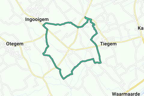 Überqueren Sie nach einem möglichen Besuch die belebte Straße, gehen Sie nach links und nach 250 m rechts in die Otegemsesteenweg. Die Kirche rechts vor Ihnen ist die Sint-Amandus und Sint-Annakerk von Otegem. In der ersten Kurve geradeaus in die Biestbeekstraat. Der Ausblick über das Scheldetal bleibt überwältigend und die hohen Schornsteine und Rauchwolken links stammen von der Elektrizitätszentrale von Ruien. Nach etwa 1 km wählen Sie an der Gabelung links, Mussestraat, und nach weiteren 50 m gehen Sie wieder links in einen schmalen, gepflasterten Pfad. Der Pfad wird zur Asphaltstraße und bringt Sie 600 m weiter an die Steinweg. Überqueren Sie, gehen Sie geradeaus in die Ruiffeleindestraat und nach 600 m links nach Ter Biest. Direkt nach dem Hof-Café Den Ouden Koestal verlassen Sie in der Kurve den Asphalt und gehen Sie rechts in einen breiten Feldweg. Überqueren Sie die Asphaltstraße und gehen Sie geradeaus auf einen Schotterweg. Der Schotterweg wird zu einem schmalen, gepflasterten Weg und bringt Sie wieder 600 m weiter auf die Asphaltstraße. Gehen Sie hier nach rechts und nach 250 m an der Gabelung nach links in die Kaankouter. Ignorieren Sie die Kaandries und gehen Sie geradeaus und 100 m weiter links in die Drieskouter. Die Kirche rechts vor Ihnen ist die Sint-Arnolduskerk von Tiegem. Stetig bergauf. Überqueren Sie nach 800 m die Straße und gehen Sie geradeaus in die Bergstraße. Ignorieren Sie rechts Heinsdal, gehen Sie aber 150 m weiter nach rechts. Sie kommen vorbei an der Likörbrennerei Sint-Arnoldus und 100 m weiter gehen Sie nach links in die Kapelledreef. An der T-Gabelung wählen Sie links und 20 m weiter gehen Sie rechts durch eine Fußgängerunterführung in den schönen Sint-Arnolduspark. Bleiben Sie links an den Teichen und überqueren Sie am zweiten Brückchen das Wasser und gehen Sie dann über eine Treppe zur SintArnolduskapel. Der Hl. Arnoldus von Tiegem (ca. 1040-1087) war ein Ritter, der Geistlicher wurde. Er ist der Schutzpatron von Tiegem und der Brauer und wird hier seit Jahrhunderten gegen Augenkrankheiten verehrt. Gehen Sie von der Kapelle nach links am Bronnenhuis vorbei und 150 m weiter am Ende des Betonweges steigen Sie geradeaus, steil durch die Blumenwiese. Oben kommen Sie durch eine Fußgängerunterführung auf eine Asphaltstraße. Gehen Sie nach rechts und nach 50 m befindet sich auf der anderen Straßenseite der Parkplatz.