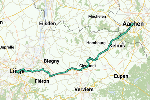 Pilgerroute für Mountainbikes zwischen Aachen und Liège. Die folgenden Städte liegen an der Route: Aachen und Liège.