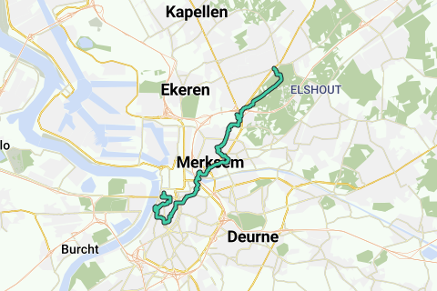 Schnellste Verbindung mit den öffentlichen Verkehrsmitteln zwischen Start- und Endpunkt: Brasschaat, Haltestelle Dr. Roosensplein mit Bus 640 nach Merksem, Haltestelle P+R Merksem, von dort mit der Straßenbahn 2 nach Antwerpen.