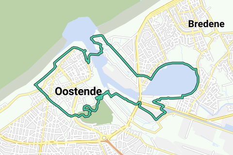 Route um Oostende mit Ausgangspunkt am Nordsee-Aquarium zur Vuurtorenwijk, rund um den Spuikom, entlang des Maria-Hendrikaparks, den Drie Gapers und dem Deich zurück zum Ausgangspunkt.