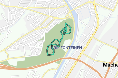 Strecke: Halte die Tribüne der Laufbahn auf deiner rechten Seite und die niedrigeren Gebäude auf deiner linken Seite. Du kommst an derselben Gabelung an, wo deine erste und zweite Schleife beginnt. Jetzt nimmst du die dritte rechts, direkt an den niedrigen Gebäuden. Du kommst an die Rückseite des letzten niedrig gelegenen Fußballfeldes (Abschluss), und diesem folgst du auf deiner linken Seite bis zu einem Tennisplatz; dort nach rechts abbiegen und hier im Zickzack bergauf bis zur Lanterikkapel weitergehen (du kommst zum Beispiel an eine T-Kreuzung, wo du rechts ab in den Weg nach oben gehen musst). Die Kapelle hältst du jetzt rechts und gehst über die Grasfläche neben der Kapelle und an der Vorderseite der Kapelle weiter über die Wiese nach unten. Auf der Wiese schneidest du einen befestigten Weg, den du links nimmst und weiter folgst. Einige Meter weiter den ersten befestigten Weg nach rechts, der dich zurück zur Wiese bringt. Links passierst du anschließend den Spielplatz, dort direkt dahinter links abbiegen und folge den Stallungen und dem Gebäude des Parkwächters auf deiner rechten Seite (Pflasterstein). Überquere den Asphaltweg und folge dem großen Pferdehaus vor dir auf deiner linken Seite, du passierst rechts ein Turmgebäude und kommst an die Vorderseite des Pferdehauses, wo du 30 m weiter die Baumallee links nimmst. An den Französischen Garten nimmst du links und gehst durch den Französischen Garten in Richtung Orangerie (Brasserie Drie Fonteinen). Am Eingang der Brasserie nimmst du links und sofort rechts und folgst der Baumallee mit dem Spielplatz links von dir und dem Parkplatz der Brasserie rechts von dir. Hinter diesem Parkplatz nimmst du den befestigten Weg rechts, der zwischen zwei Gebäuden nach unten führt. Achtung: Hinter diesen Gebäuden hast du zwei kleine Treppen nach unten: Steige dort von deinem Rad ab oder mäßige deine Gehgeschwindigkeit. Folge dem Zickzack dieses Weges und nimm an der T-Kreuzung links ab. An der Y-Gabelung nimmst du rechts, und im Abstieg (50 m bevor du auf die große Wiese kommst) nimmst du den befestigten Weg nach rechts (Ganzenvoetweg). Diesen Weg folgst du bis zur Kurve (nicht bis zur höheren Wiese) und biegst links in den Brugweg (unbefestigter Waldweg) nach unten ab. Unten kommst du an die Überreste einer Brücke über einen Waldbach, wonach der Weg wieder befestigt nach oben geht. Auf diesem Weg nimmst du die erste rechts, die dich zum Abschluss eines Tennisplatzes bringt. Dort nach rechts abbiegen und dem Tennisplatz auf deiner linken Seite folgen. Du kommst an eine T-Kreuzung an den niedrig gelegenen Teichen, wo du zweimal links abbiegen musst. Am Ende des Teiches hast du ein überdachtes Tennisgebäude, das du auf deiner rechten Seite lässt, und einen Tennisplatz, den du auf deiner linken Seite lässt. Nimm diesen befestigten Weg zum Parkplatz, wo du an den Tribünen deine Schleife abgeschlossen hast.