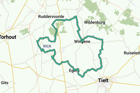 Ignoriere eine Straße links und drehe weiter vor dem Hof Berkenhof mit der Straße nach rechts und fahre entlang einer Baumreihe, bis du links in die Hulswallestraat fahren kannst. Du passierst ein Infobord über 'Amusante Landschaft', eine Tieltser Landwirtschafts-Radtour, die hier auf Mais aufmerksam macht. Überquere weiter geradeaus die Vorfahrtsstraße und fahre weiter durch die Poelvoordestraat. An der T-Kreuzung rechts ab, du fährst immer noch durch die Poelvoordestraat. ● An der Gabelung an der dreieckigen Kapelle kommst du zu KP 42. Links, Richtung KP 27. Nimm danach die erste Straße rechts, das ist die Motestraat und folge dieser bis zum Ende. Drehe dort links ab und folge der Waalbosstraat, vorbei an einer Backsteinkapelle (1947), die an einem Hof steht, bis zu einer Vorfahrtsstraße. Überquere diese geradeaus und fahre weiter durch die Kleine Veldstraat. Folg dieser bis zu KP 27. Links in die Keukelstraat, Richtung KP 34. Ignoriere links die Kortstraat, fahre an der Kirche von Sint-Jan vorbei und überquere dann die kleine Kreuzung am Volkscafé Vierwegen geradeaus. ● Fahre am Ende des Agglomerationsschildes von Sint-Jan vorbei und weiter durch die offene Landschaft bis zu KP 34. Links Richtung KP 25 durch den Hoogweg. Du fährst vorbei an Gewächshäusern, Einzelbau und zwischen Wiesen und Äckern. An der Gabelung mit der geraden Straße, die zu einer Sackgasse führt, folge der Hoogweg rechts bis zur Stopptafel. Überquere die Straße geradeaus und fahre weiter durch die Zandbergstraat. Diese wird zur Einbahnstraße und führt dich zur Kirche von Wingene. Drehe hinter der Kirche rechts und gleich danach links in die Einbahnstraße. ● An der Ecke mit Sfeercafé - Bistro Peetje Klakke kommst du zu KP 25. Rechts ab Richtung KP 50. Du fährst am Kirchplatz vorbei und drehst an der Vorfahrtsstraße rechts ab, Richtung Beernem. Du fährst vorbei an der OKay und der Kunstakademie von Wingene, drehst dann links in die Leenmolenstraat und fährst das Dorf wieder hinaus.