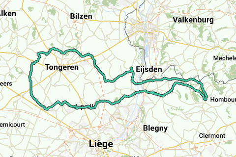S.M.V. – S.G.V. – Warsage - Bombaye - Mons – Visé – Haccourt (Delhaize) – Heure-le-Romain – Fexhe-Slins – Villers-Saint-Siméon – Juprelle – rechts Othée – Richtung Villers-l’Evêque (immer geradeaus, T-links nach Odeur – durch Crisnée, Thys, Otrange zur großen Straße, überqueren - vor Vechmaal – Bommershoven – große Straße überqueren – Haren – Richtung Jesseren – rechts Overrepen – große Straße überqueren – 1ste Straße rechts Neerrepen – links Riksingen – große Straße überqueren Richtung ’s Herenelderen – Ketsingen – Genoelselderen – Herderen – große Straße überqueren – Valmeer – Bassenge – Wonck – Hallembaye – Haccourt – Visé – Moelingen – S.G.V. – (Kattenrot) – Ulvend – De Plank - Veurs - S.M.V.