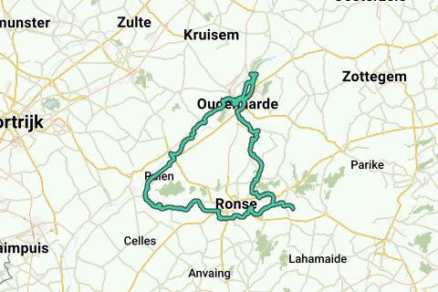 Rundfahrt Oudenaarde - Elsegem (Domäne de Ghellinck) - Berchem - Ruien - Orroir - Ronse - Ellezelles (Zwischenstopp in Quintine nach 37 km) - Louise-Marie - Maarkedal - Leupegem - Eine - Oudenaarde
